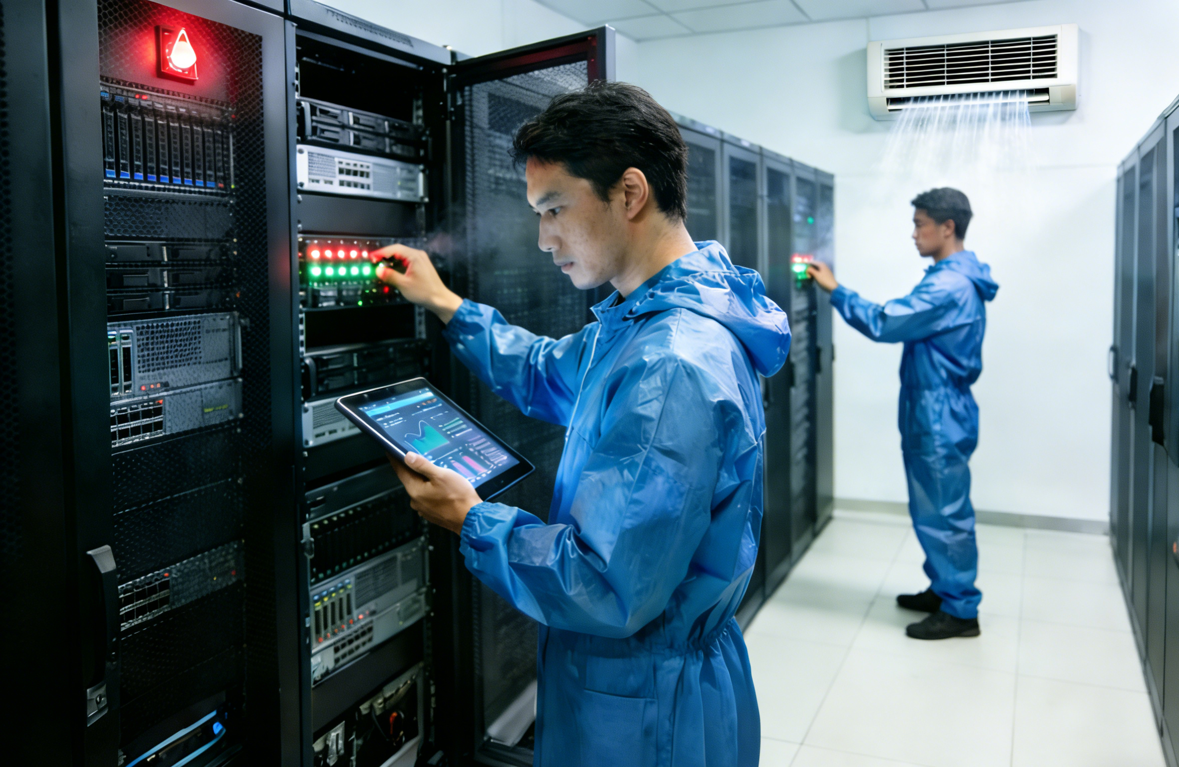 精密空調(diào)系統(tǒng):根據(jù)設(shè)備熱負(fù)荷,計算制冷量,部署精密空調(diào),確保溫濕度恒定在最佳范圍(溫度22-24℃,濕度40-55%)。